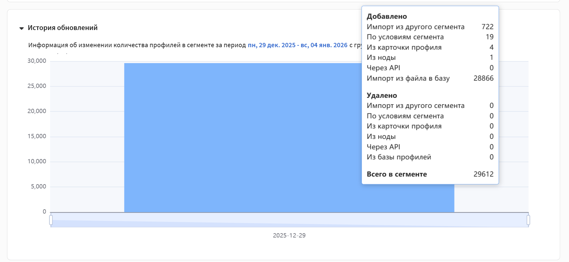 При наведении курсора на столбец графика появится всплывающая подсказка. В ней показано суммарное изменение числа профилей и детализация: по каким конкретно действиям и в каком количестве профили были добавлены в сегмент или удалены из него: