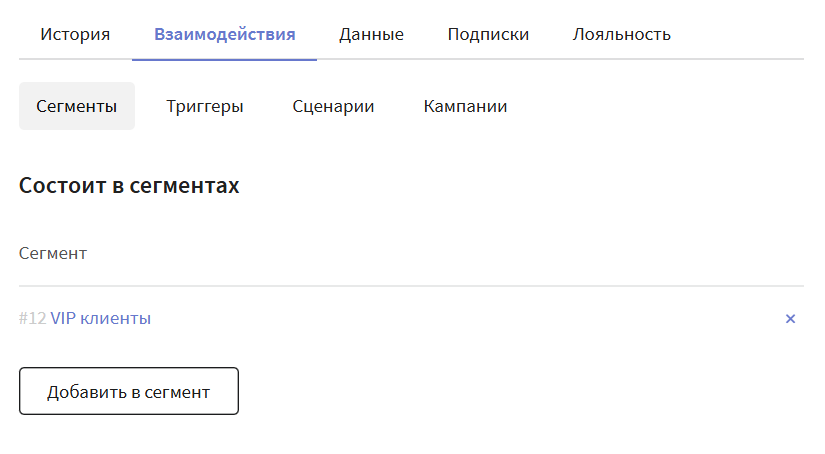 Добавить или удалить из сегмента профиль можно вручную. Для этого в карточке профиля перейдите во вкладку Взаимодействия в блок Сегменты, выберите необходимый сегмент и отредактируйте: