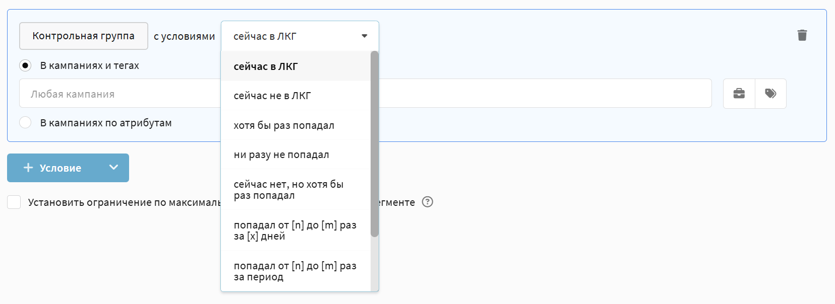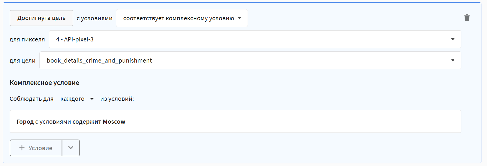 • Соответствует / Не соответствует комплексному условию — расширенная выборка на основе дополнительных данных, переданных при регистрации цели через API.