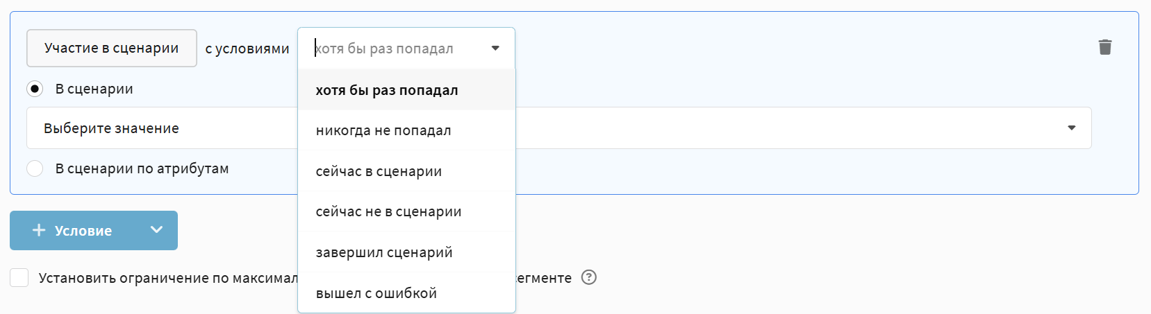 Сегментация по участию в сценариях автоматизации. Позволяет выбрать профили, которые находятся в сценарии, завершили его или вышли с ошибкой.