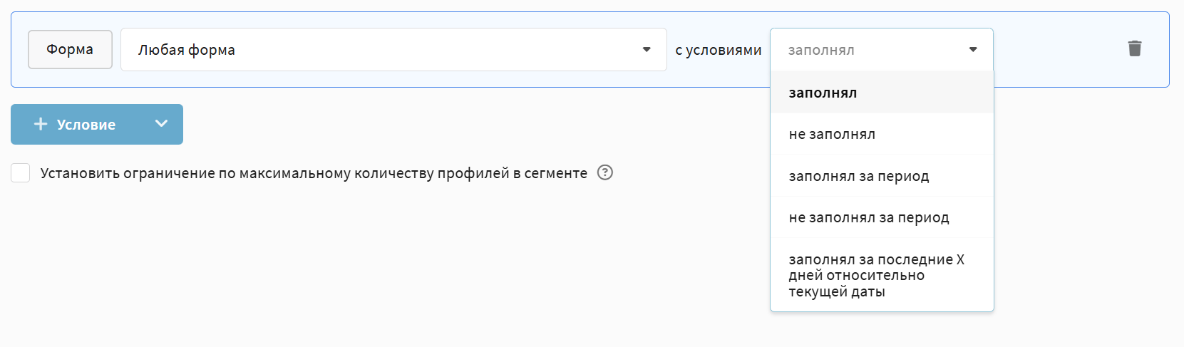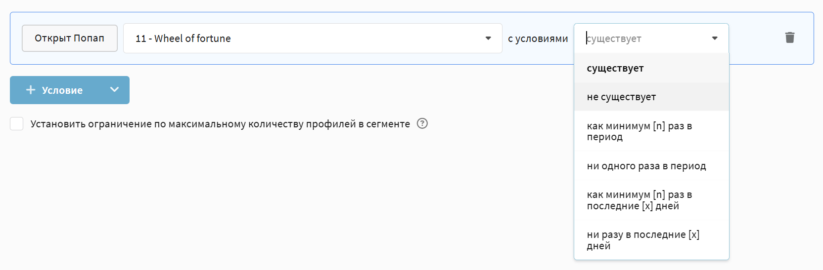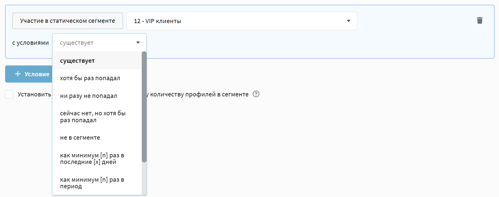 Выборка профилей на основе их участия в других сегментах (динамических или статических). Позволяет создавать сложные многоуровневые выборки.