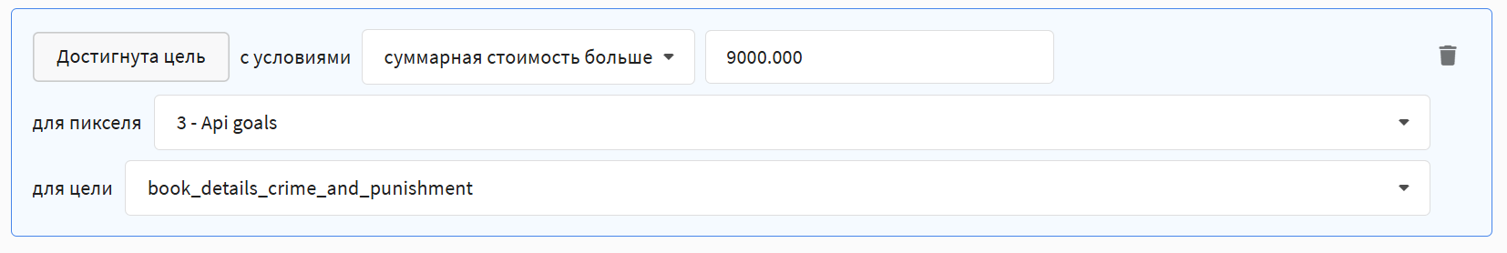 • Суммарная стоимость — рассчитывает сумму стоимости достигнутых целей. Операторы: больше / меньше / равна. Можно указать расчёт за всё время, за период или за последние [x] дней.