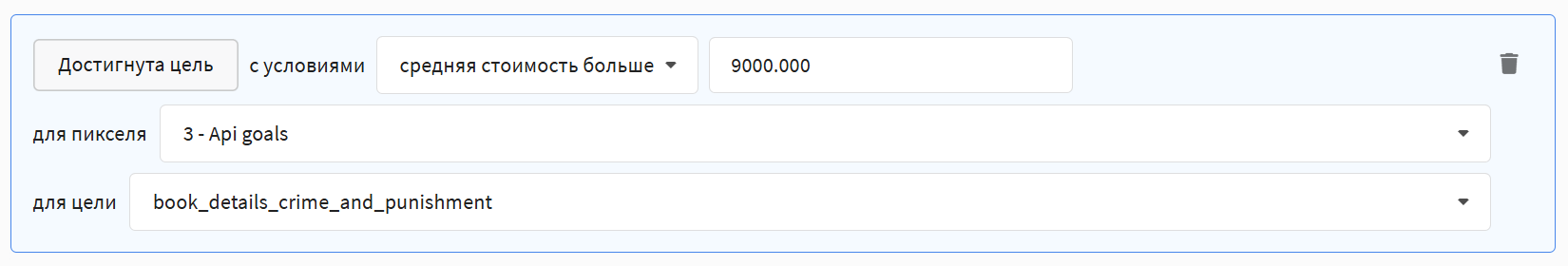 • Средняя стоимость — рассчитывает среднее арифметическое стоимости достигнутых целей. Операторы: больше / меньше / равна. Можно указать расчёт за всё время, за период или за последние [x] дней.
