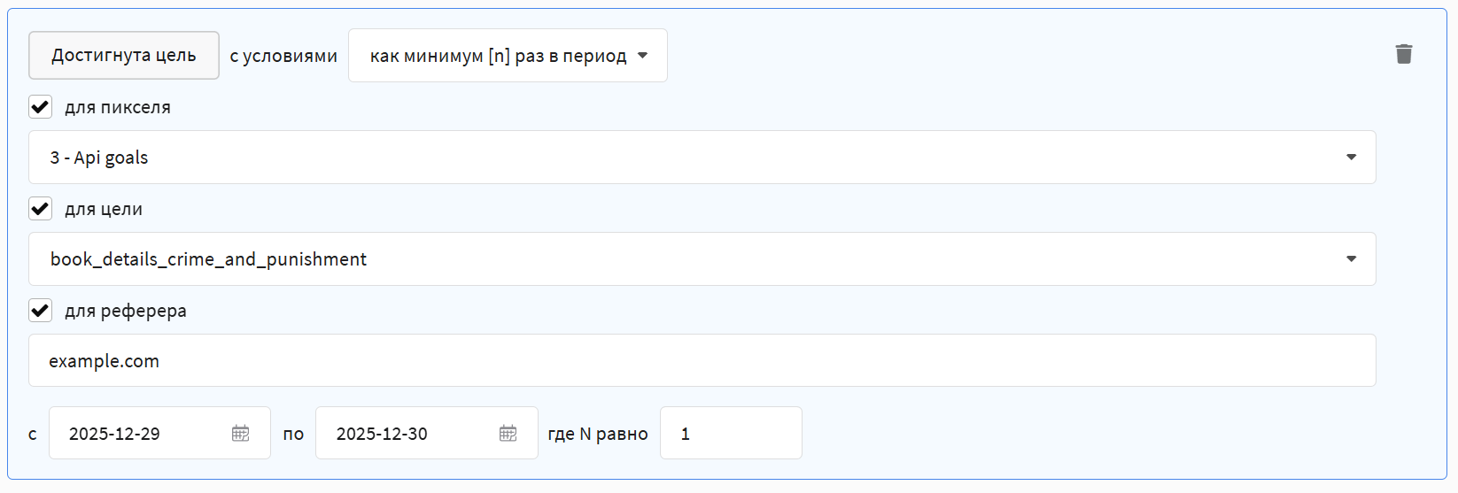 • Как минимум [n] раз / Ни разу — выборка по количеству и частоте совершаемых действий. Можно уточнить цель, пиксель или реферера (источник трафика).