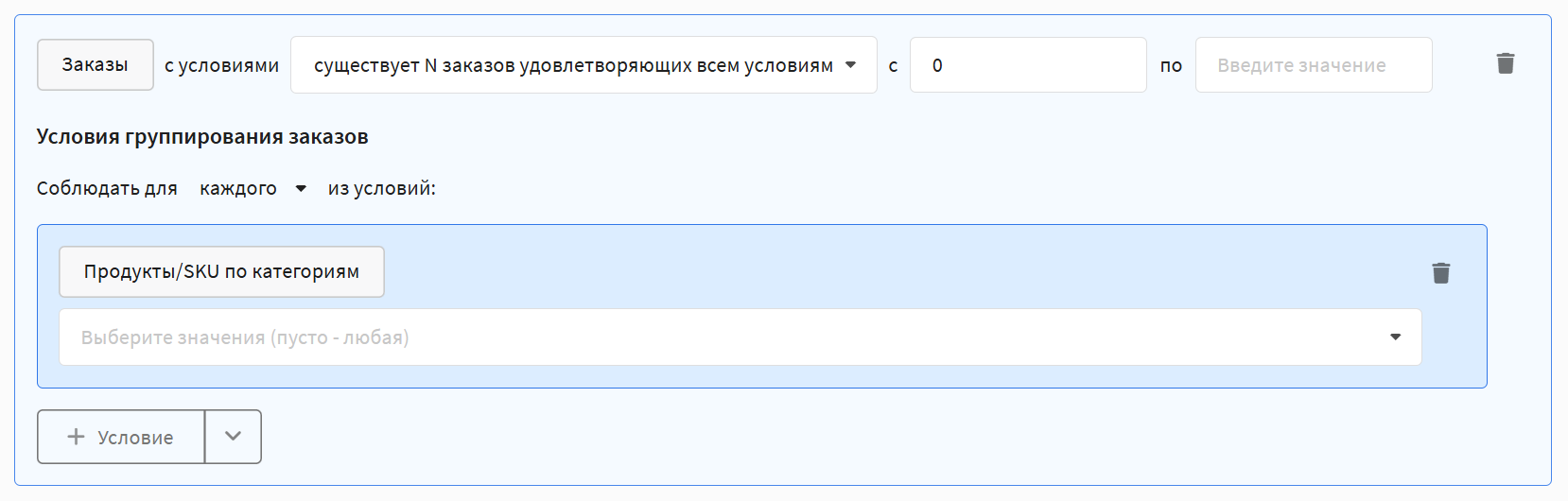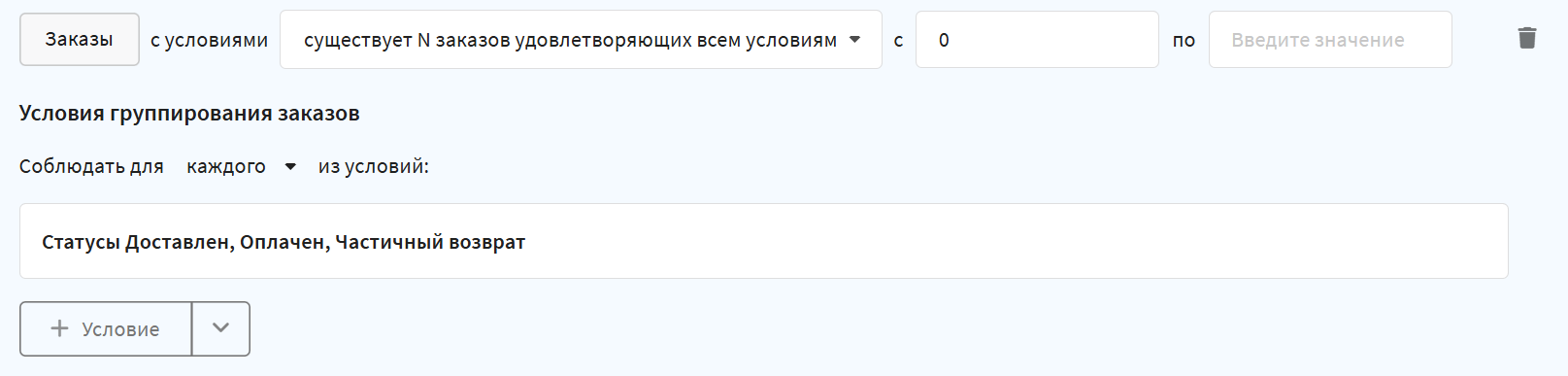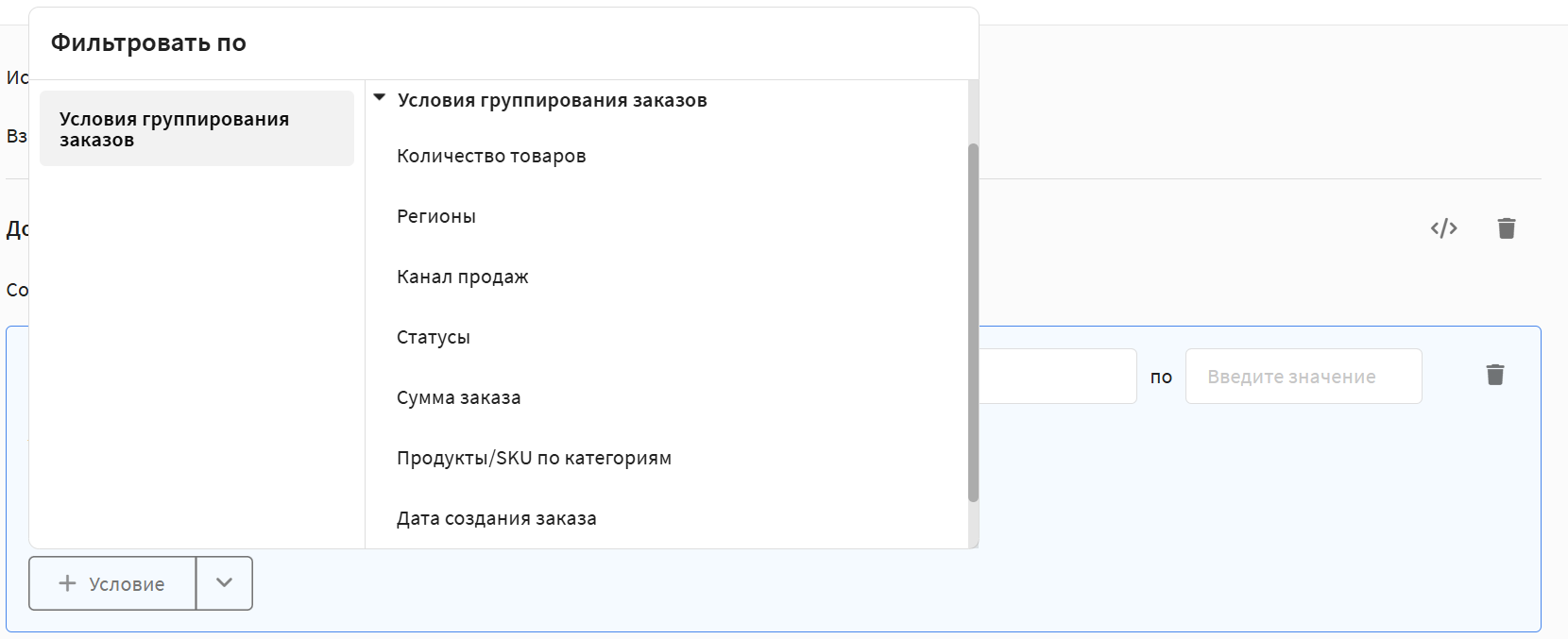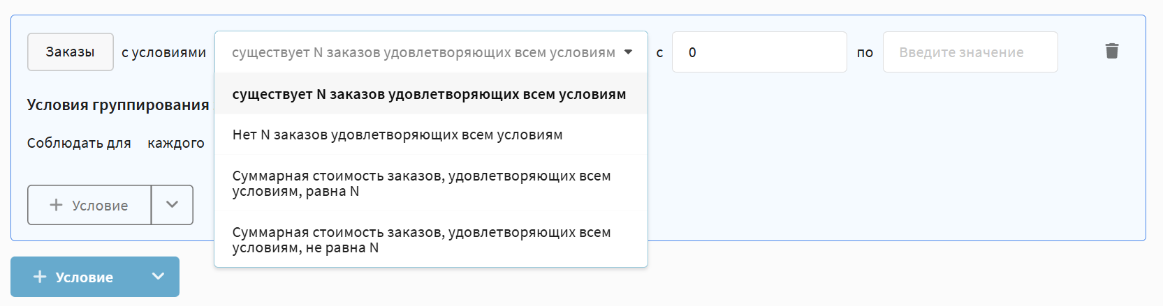 В любом из правил, описанных выше, можно задать дополнительные условия, чтобы уточнить, какие именно заказы учитывать. Доступны следующие параметры: