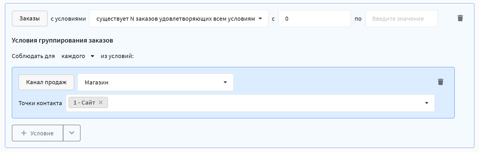 Выбирает заказы, совершенные в одном канале продаж. Можно указать несколько точек контакта.