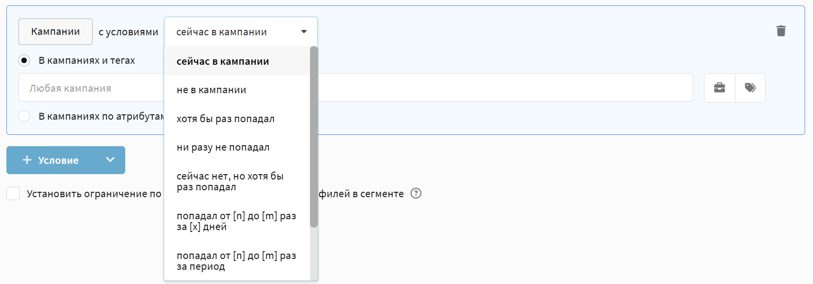 • попадал как минимум [n] раз за [x] дней — профиль попадал в кампании указанное количество раз за последние X дней.
