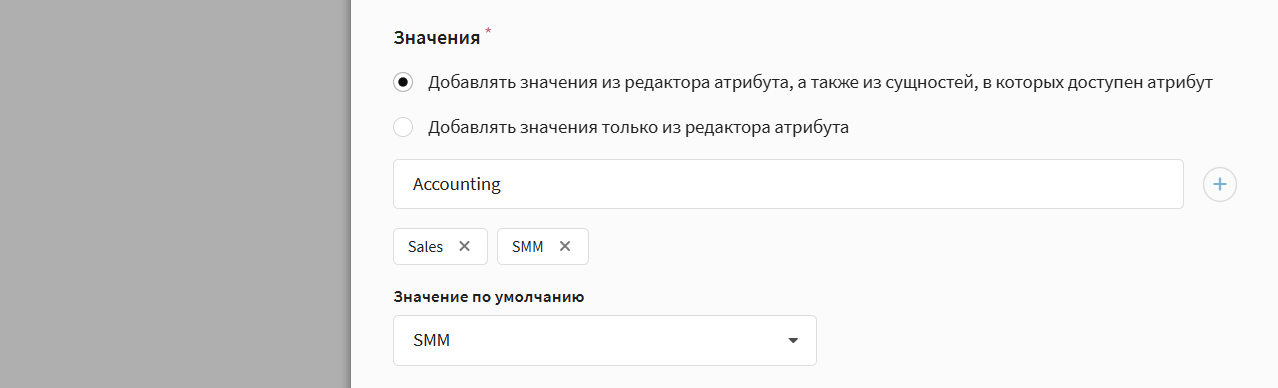 Следующим шагом определите значения атрибута. Вы также можете разрешить пользователю не только выбирать значение из заранее созданных, но и добавлять новые при редактировании сущности. Для каждого атрибута можно установить до 30 значений: