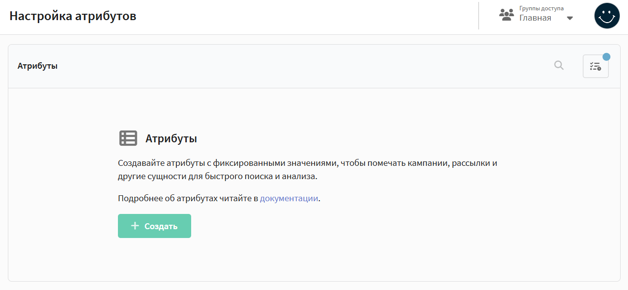 Чтобы перейти к созданию и настройке атрибутов, откройте раздел Настройки → Настройка атрибутов. Откроется панель управления атрибутами. Создайте первый атрибут, нажав на соответствующую кнопку: