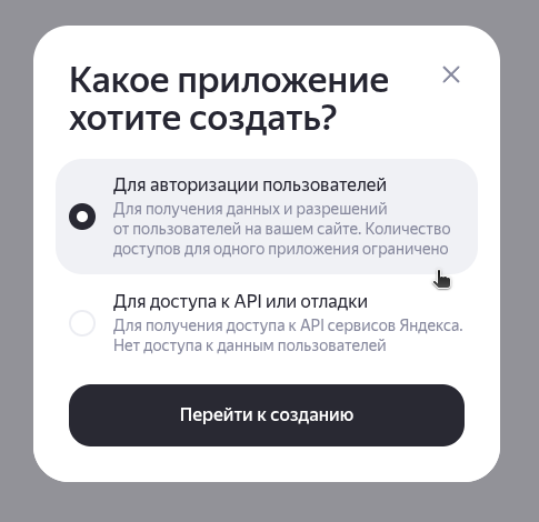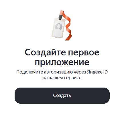 Перейдите на страницу Яндекс.OAuth и войдите в свой аккаунт Яндекс. Перейдите в раздел Ваши приложения и нажмите Создать. | ![]() |