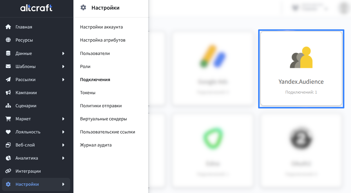 Перейдите в раздел Настройки — Подключения. Выберите Yandex.Audience. | ![]() |
