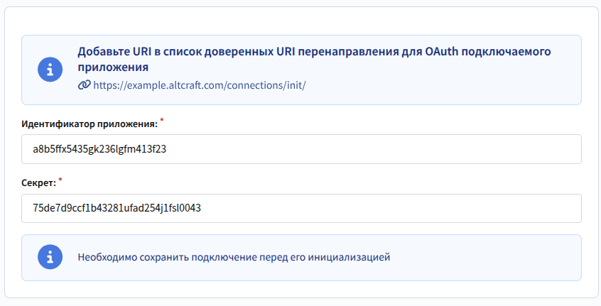 Укажите название и описание подключения. В поле "Идентификатор приложения" укажите Client ID приложения, а в поле "Секрет" — Client Secret. | ![]() |