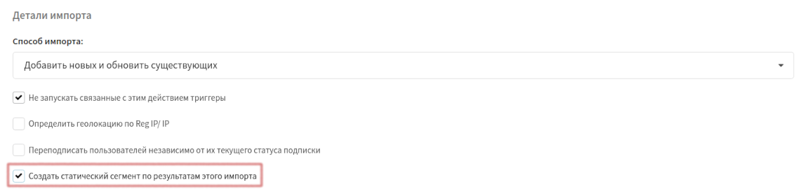 Если мы импортируем профили в базу с помощью файла, в деталях импорта можно включить опцию "Создать статический сегмент по результатам импорта".