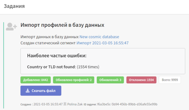 Таким образом, как только импорт завершится, будет создан новый статический сегмент, куда войдут только что импортированные профили. Название статического сегмента будет сгенерировано автоматически (например, Импорт 2021-03-51 16:55:47